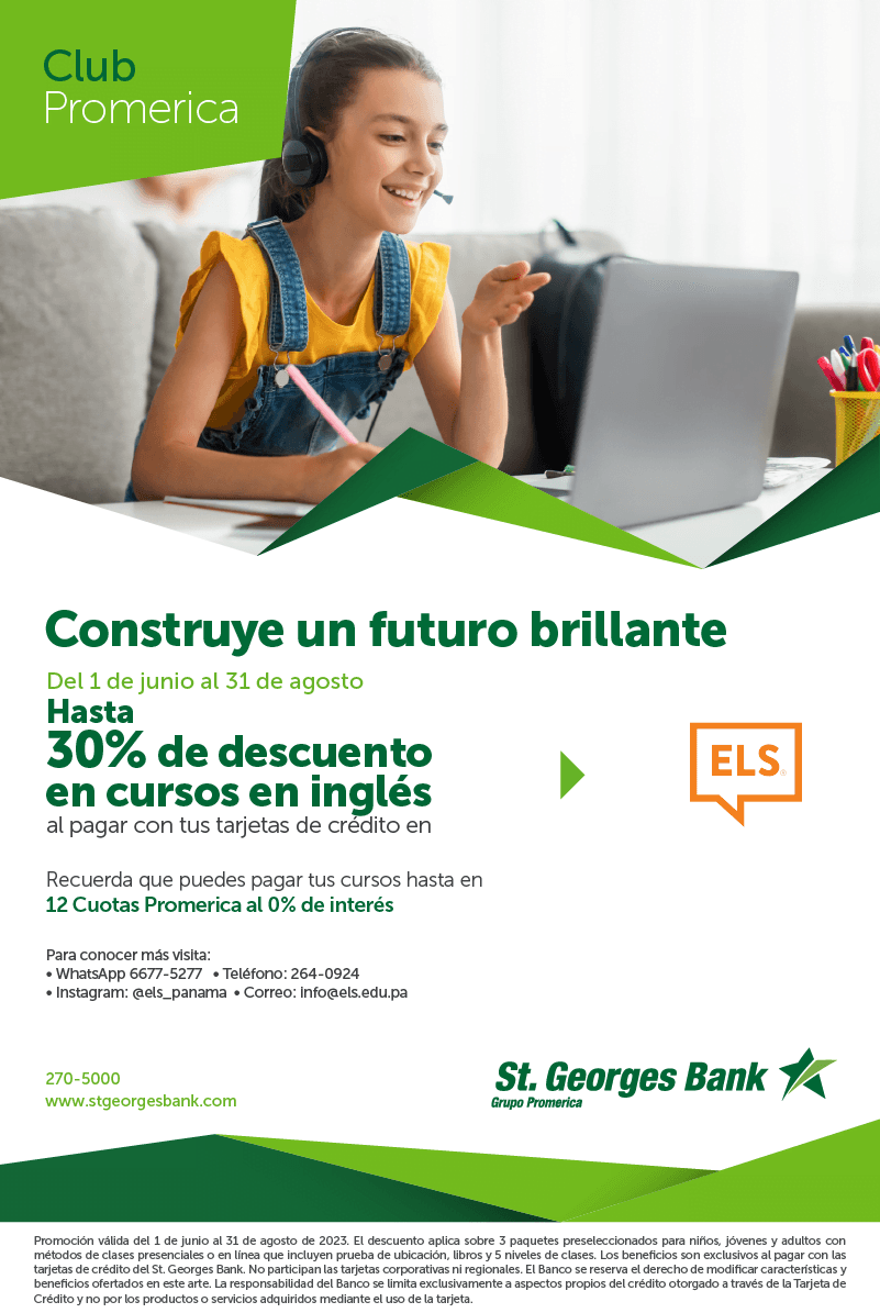 ELS y St. Georges Bank te brindan esta super promoción de hasta 30% de descuento en nuestros programas de inglés, con 3 super paquetes para estudiar inglés al 0% de interés con tus tarjetas de crédito hasta 12 cuotas.